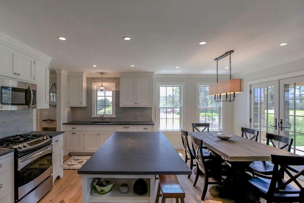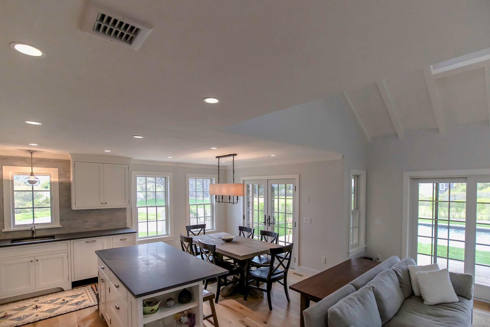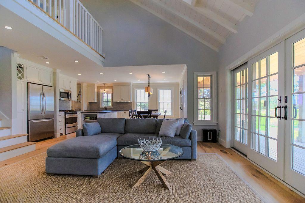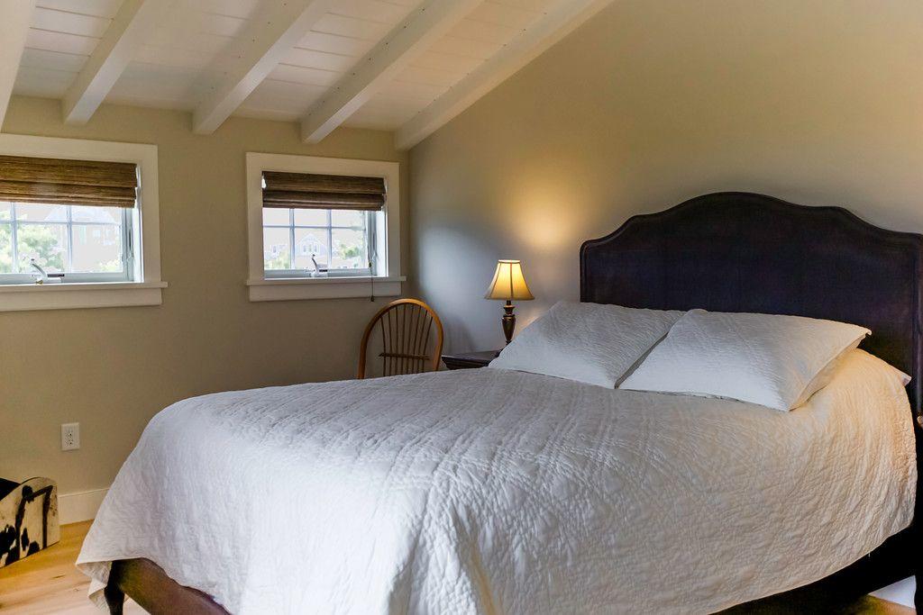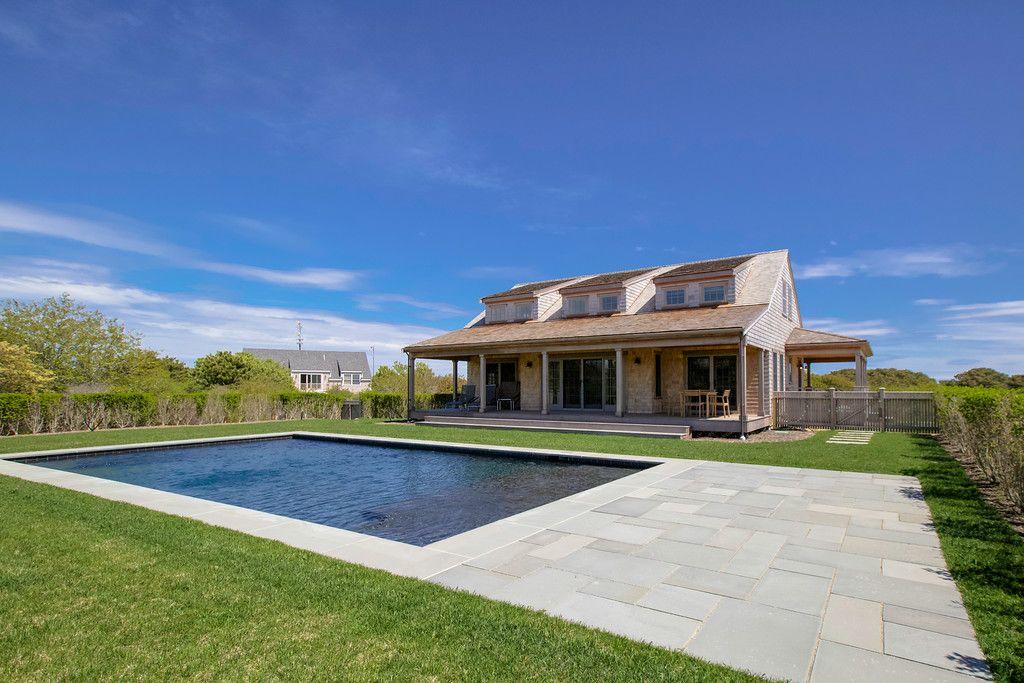 This beautiful Nantucket summer rental in Dionis features a pool and views of Nantucket Sound. The cathedral ceiling great room with custom kitchen opens out onto the covered deck and pool patio., A first floor master (K) has an en suite bathroom and private door to the deck. The second floor includes a spacious loft with built in double beds for sleeping as well as a second guest room (Q) with views of Nantucket sound.