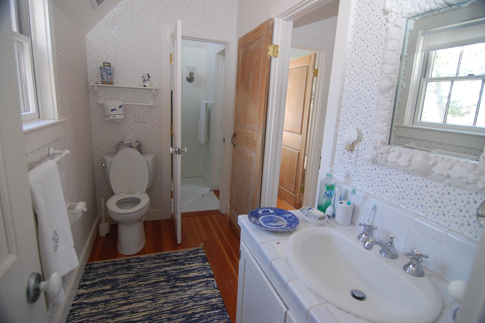 Hilltop is located on the head of the harbor in Wauwinet and offers one of the best views on the island. Enjoy sunset views and direct access to the sandy, harbor beach just in front of the house. The main part of the house was rebuilt in 1999. The first floor is one large kitchen/dining/living area with expansive views of the harbor beyond. There is also a den with TV and half bath. The old, beach cottage part of the house is accessed from the den. In this area there are two twin bedrooms, a powder room, a bedroom with double bed, a fourth bedroom with king bed and views of the water. The full bath is just outside the bedroom door with access to the outside shower. The second floor, located in the main part of the house has a twin bedroom, shared hall bath and a queen bedroom with ensuite bath. Property includes a boat mooring.