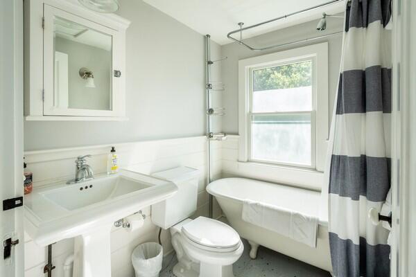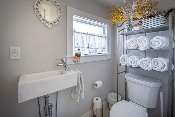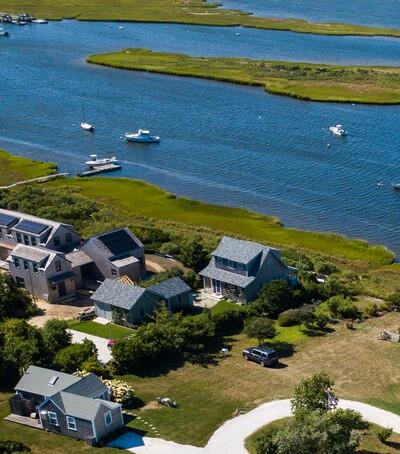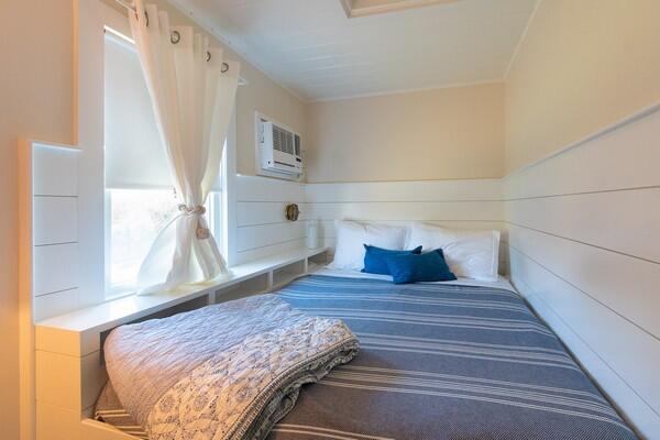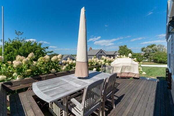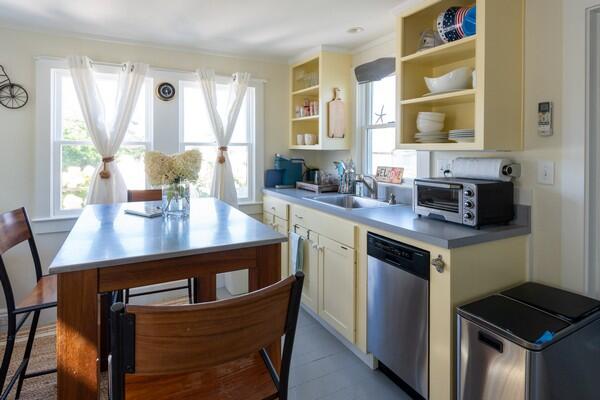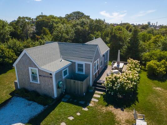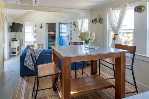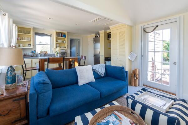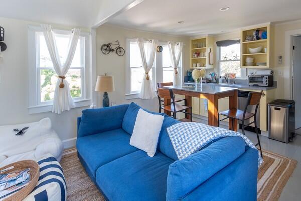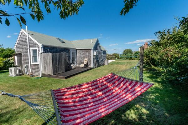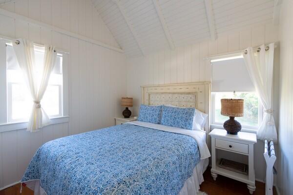 This recently updated West End cottage has beautiful harbor views. There are multiple living areas inside and out. The property is air conditioned, newly furnished and located about 50 yards from the public pier-a great spot to launch kayaks or a small boat. This quaint cottage provides modern amenities, new furnishings and the perfect setting to enjoy a summer vacation. Located at the opposite end of a large lot is another rental home. The cottage may be rented separate , or when the houses are rented together, it serves as the perfect space for extra guests. This is a NON-SMOKING house, and pets are NOT permitted. First Floor: From a large yard with water views is the front porch which is complete with outdoor furniture and a grill. You enter into a cozy kitchen and living room area with all new appliances including a dishwasher, washer/dryer and flat screen TV. Accessed from the living room area area s small single, loft bed and a shared full bathroom with a cast iron tub and the back deck with an outdoor shower. In the kitchen, there is bar seating for three. In additional to the shared full bath, there is also a half bathroom accessed from the kitchen with private access from the master bathroom which has a cathedral ceiling, its own air conditioning zone, and a queen bed. The third bedroom is a walk-through bunk room.