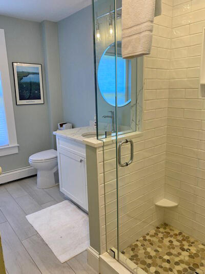 Second floor: Master bedroom (queen), master bath (tub/European, handheld shower), guest bedroom (queen), hall bath (shower), door to small deck, guest bedroom (twins).