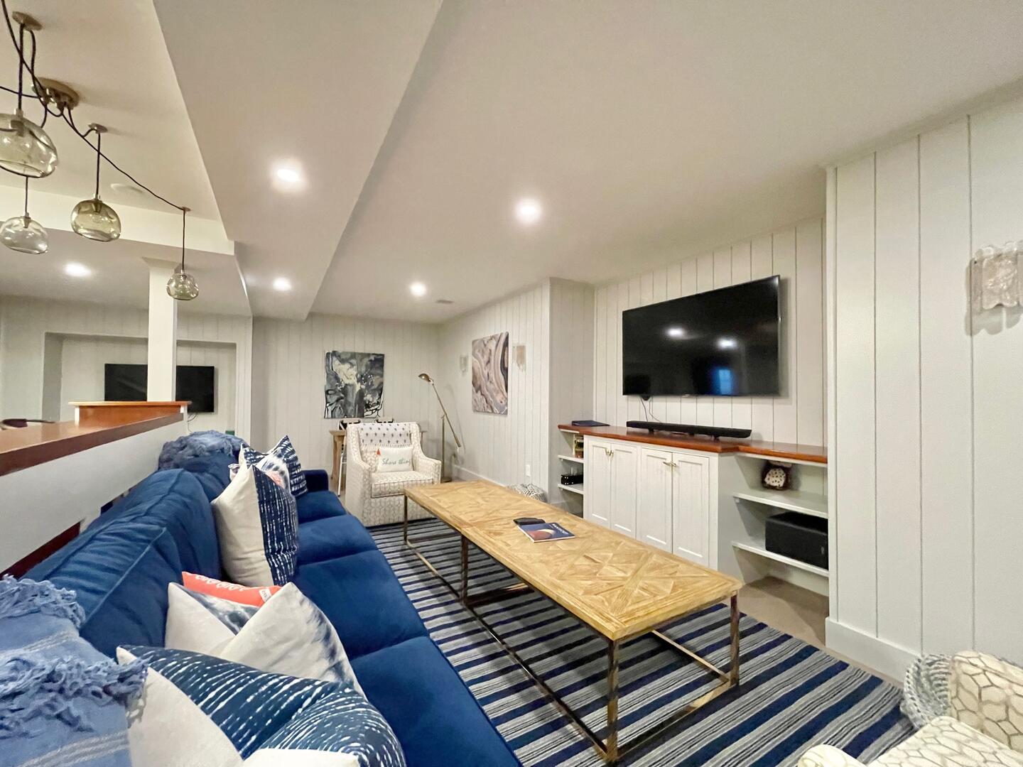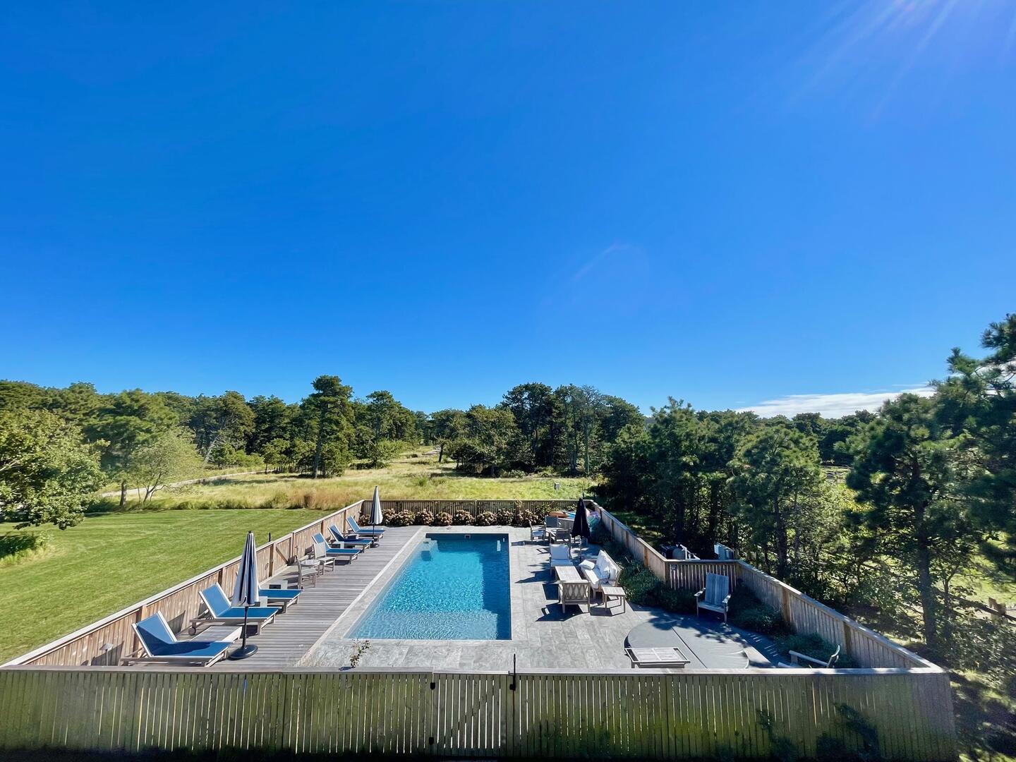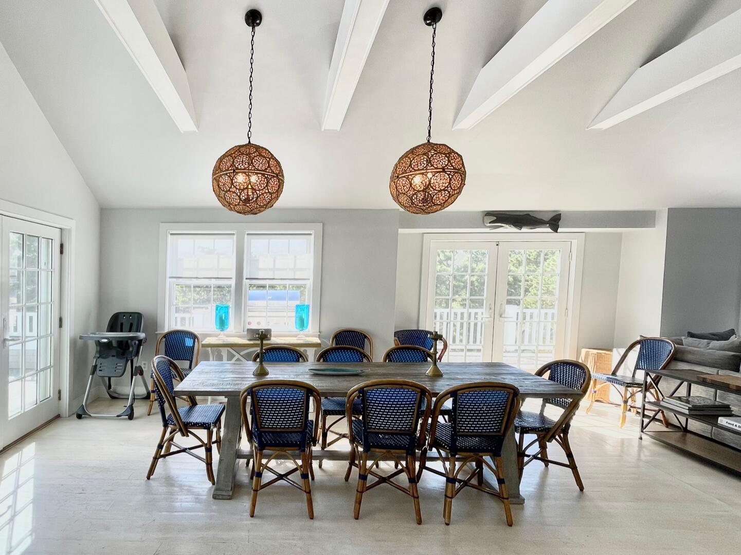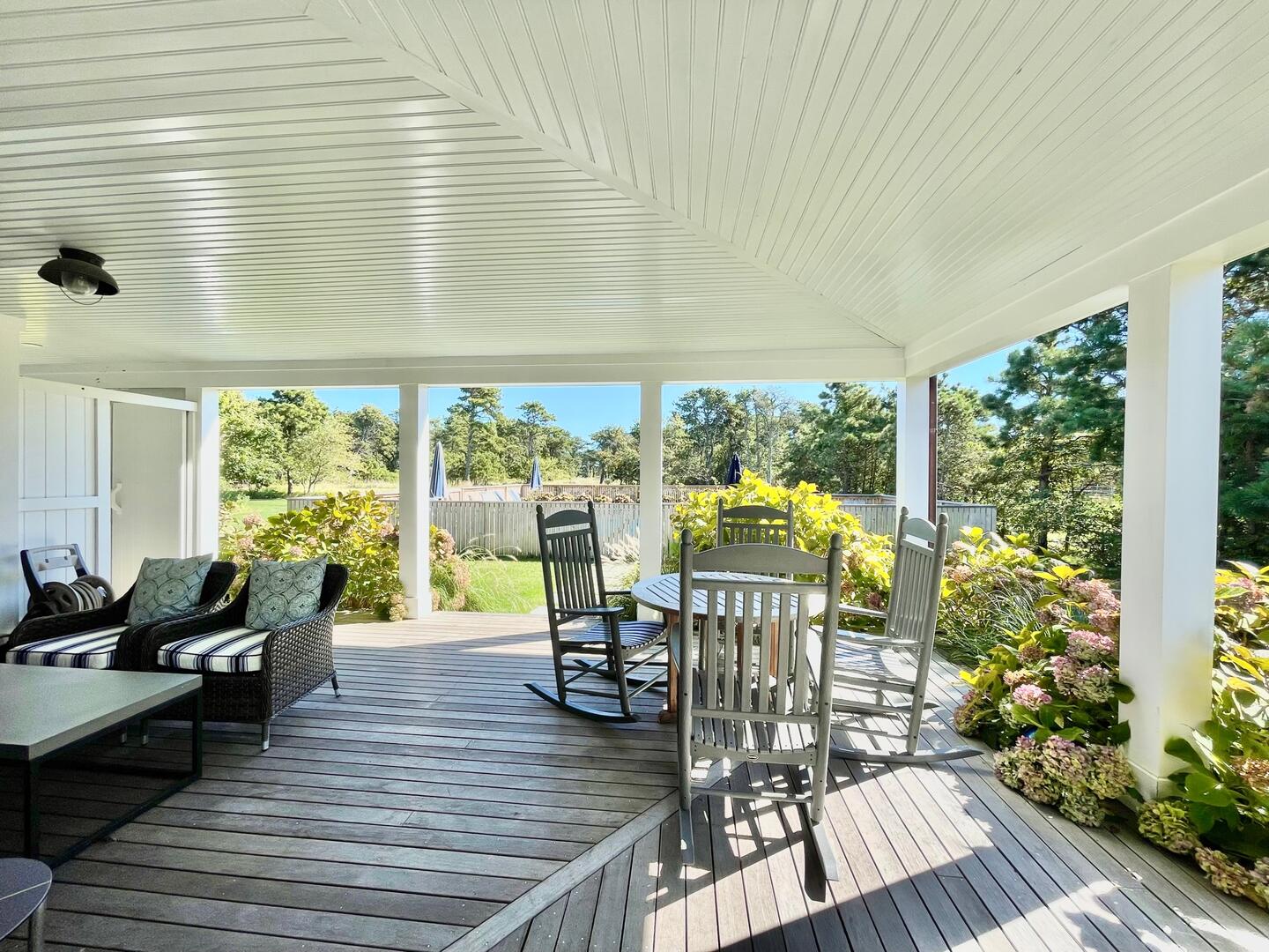 Seven bedroom upside down home located close to Cisco Brewers and Bartlett’s Farm with easy access to town and the beach. First Floor : Primary bedroom (king), fireplace and flat screen TV, ensuite bath (tub/shower). Bedroom (queen) with ensuite bath (shower). Bedroom (bunk – twin over full). Hall bath (tub/shower). Bedroom (queen) with ensuite bath (shower). The side hall leads you out to the covered porch where rocking chairs beckon you to sit down and relax! Second Floor: The open plan layout hosts the kitchen, dining area and living area. The kitchen has a Subzero refrigerator, Viking range, bar area with ice maker and subzero wine fridge, large central island with bar sink. The dining area has a Swedish style trestle table and French bistro chairs with seating for 10. The living room is spacious with two seating areas. One with an oversized sectional grouped around the wood burning fireplace with raised bluestone hearth and large flatscreen TV above. The second conversation area has bookshelves with games, the latest summer novels, and a sonos sound system. Two sets of French doors lead you out to the wrap around deck which offers panoramic views of both a neighboring horse farm and the tree tops of this scenic 2 acre property. Various outdoor seating areas and a Wolf gas grill make this the ultimate entertaining space. Beyond the kitchen is bedroom 5 with a king sized bed and en suite bathroom with marble vanity, inset medicine cabinet and shower with marble niche. There is also a shell themed powder room off the kitchen. The house is fully equipped with all necessary linens, towels, beach towels, beach chairs, cooler, beach umbrella and basic supplies such as toilet paper, tissues, paper towels, dish soap, laundry soap, bath soap, etc…The house has central air conditioning, wifi, cable TV with premium channels such as HBO and Showtime, flatscreen TVs in all bedrooms and the living room. An outdoor shower, ample parking and vast lawn makes this the perfect vacation destination. *The property is also available to rent for weddings, please inquire for pricing. LOWER LEVEL: Large living room with flatscreen TV plus additional TV for gaming. Wet bar with Subzero refrigerator drawers, ice maker and sink. Two additional bedrooms, one with king bed and the other with queen over queen bunk beds. Tv’s in each room, central AC and full bathroom with walk in shower.