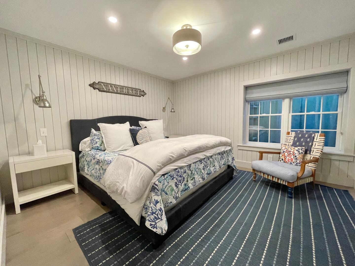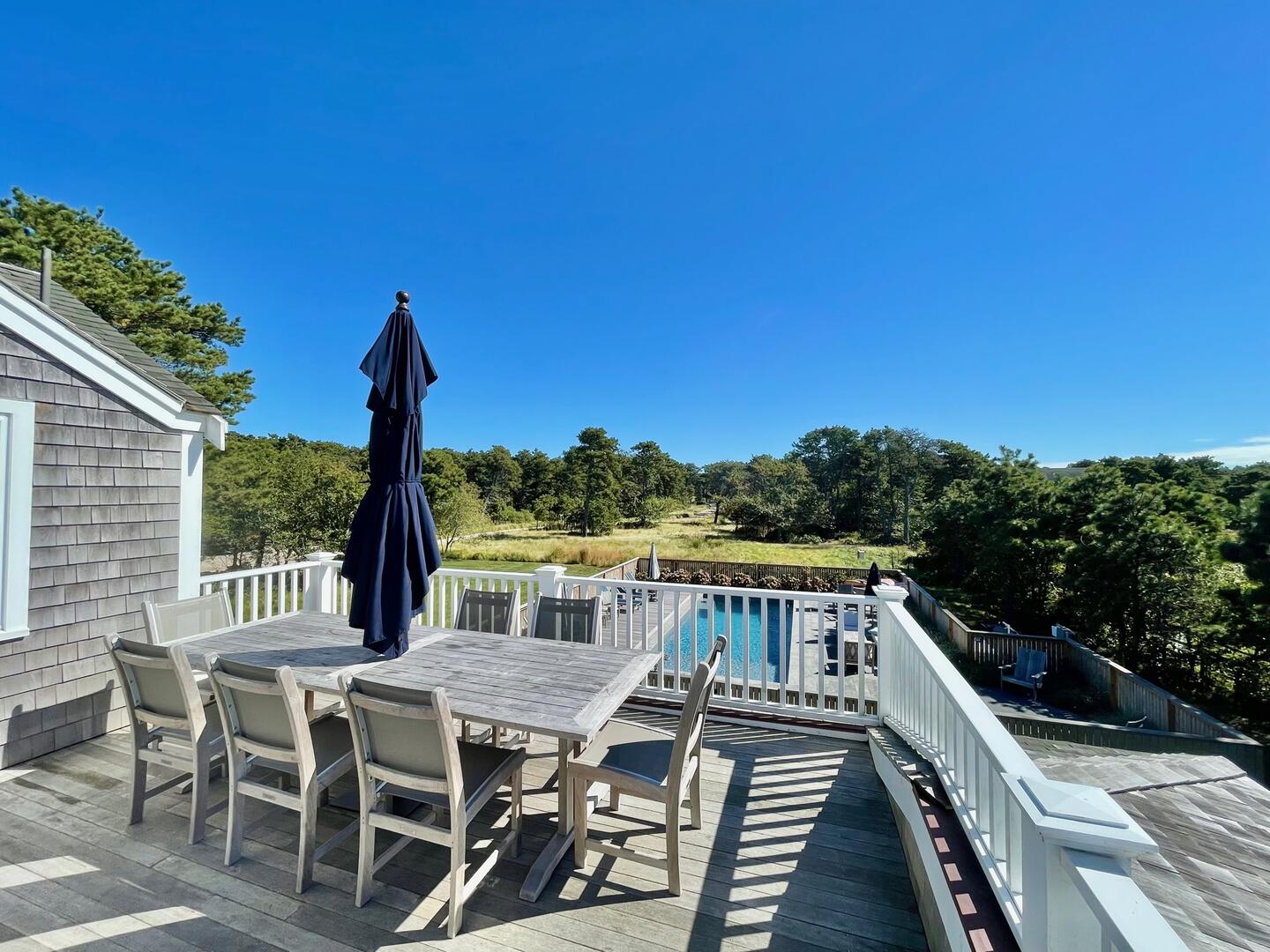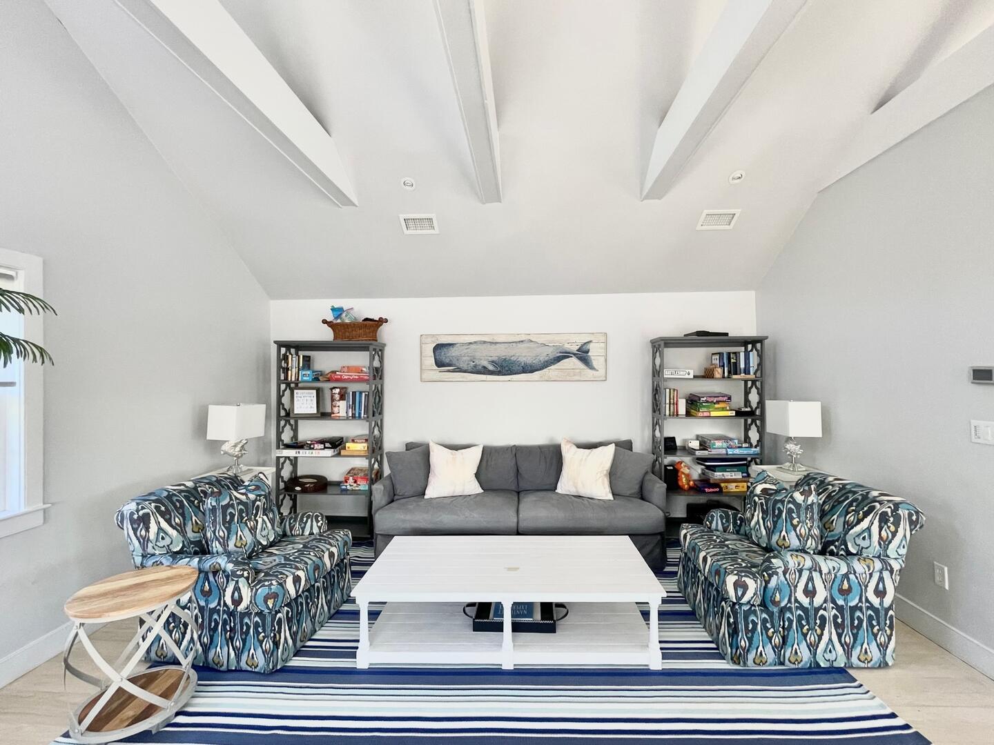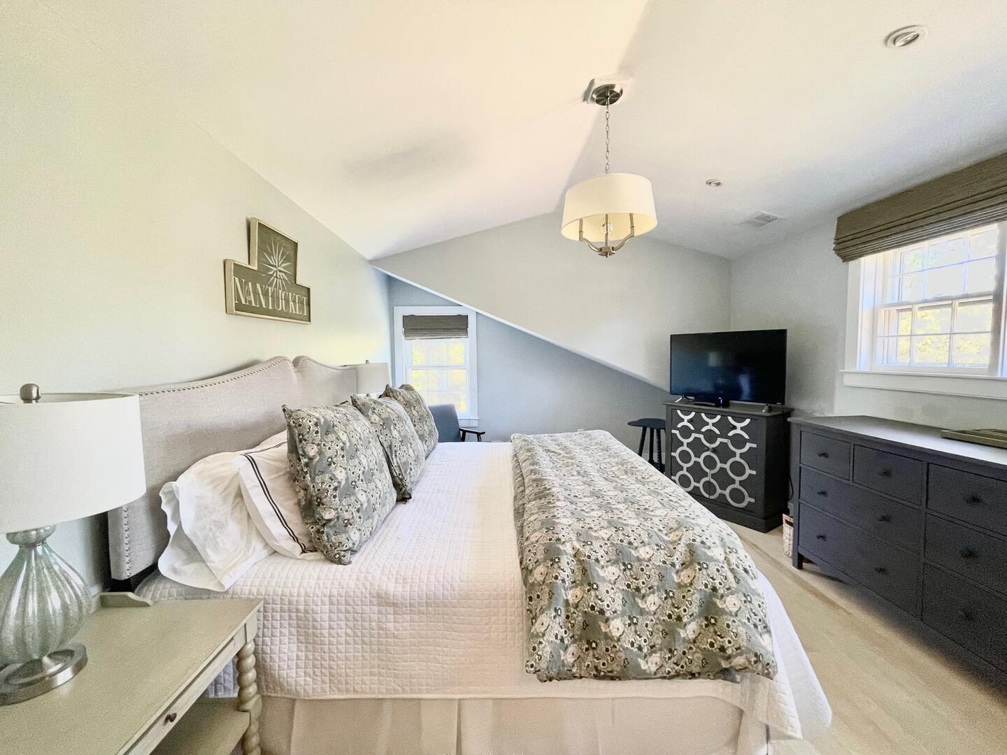 Seven bedroom upside down home located close to Cisco Brewers and Bartlett’s Farm with easy access to town and the beach. First Floor : Primary bedroom (king), fireplace and flat screen TV, ensuite bath (tub/shower). Bedroom (queen) with ensuite bath (shower). Bedroom (bunk – twin over full). Hall bath (tub/shower). Bedroom (queen) with ensuite bath (shower). The side hall leads you out to the covered porch where rocking chairs beckon you to sit down and relax! Second Floor: The open plan layout hosts the kitchen, dining area and living area. The kitchen has a Subzero refrigerator, Viking range, bar area with ice maker and subzero wine fridge, large central island with bar sink. The dining area has a Swedish style trestle table and French bistro chairs with seating for 10. The living room is spacious with two seating areas. One with an oversized sectional grouped around the wood burning fireplace with raised bluestone hearth and large flatscreen TV above. The second conversation area has bookshelves with games, the latest summer novels, and a sonos sound system. Two sets of French doors lead you out to the wrap around deck which offers panoramic views of both a neighboring horse farm and the tree tops of this scenic 2 acre property. Various outdoor seating areas and a Wolf gas grill make this the ultimate entertaining space. Beyond the kitchen is bedroom 5 with a king sized bed and en suite bathroom with marble vanity, inset medicine cabinet and shower with marble niche. There is also a shell themed powder room off the kitchen. The house is fully equipped with all necessary linens, towels, beach towels, beach chairs, cooler, beach umbrella and basic supplies such as toilet paper, tissues, paper towels, dish soap, laundry soap, bath soap, etc…The house has central air conditioning, wifi, cable TV with premium channels such as HBO and Showtime, flatscreen TVs in all bedrooms and the living room. An outdoor shower, ample parking and vast lawn makes this the perfect vacation destination. *The property is also available to rent for weddings, please inquire for pricing. LOWER LEVEL: Large living room with flatscreen TV plus additional TV for gaming. Wet bar with Subzero refrigerator drawers, ice maker and sink. Two additional bedrooms, one with king bed and the other with queen over queen bunk beds. Tv’s in each room, central AC and full bathroom with walk in shower.
