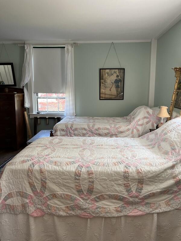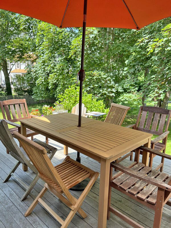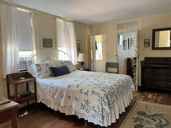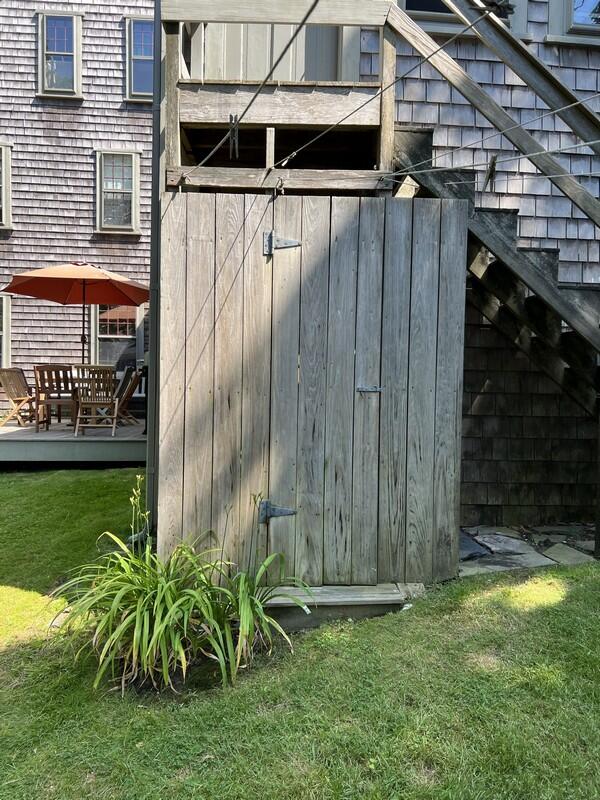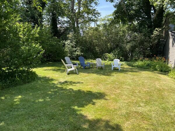 Step back in time and enjoy the simple things in this 5 bedroom 3 1/2 bath home. Relax under the shade trees, read a book, wander through town or head to the beach from this well loved historic home. First floor: living room, den with TV, dining room, pantry, kitchen with access to deck and side yard, powder room, bathroom (tub), and a bedroom (double). Second floor: bedroom (queen), bedroom (twins), shared bath (tub), bedroom (queen) with bathroom (tub). **The fifth bedroom (with shower bathroom) is a connecting bedroom accessed through the queen bedroom or from an exterior staircase through the adjacent laundry room. Wonderful large yard with an outdoor shower and off street parking. $350 cleaning fee.