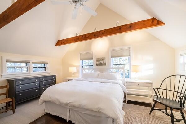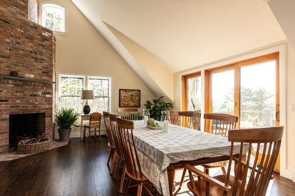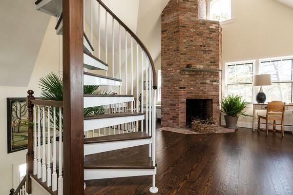 The second floor of the home, with vaulted ceilings, is an open concept layout. It enjoys a well appointed kitchen, living room area, dining area with fireplace, reading nook and king bedroom with full bath. A large deck with outdoor furniture and grill are located outside the sliding doors off the dining area. Within this room is a spiral staircase leading to a spacious loft with ships ladder to a large Widows Walk.
