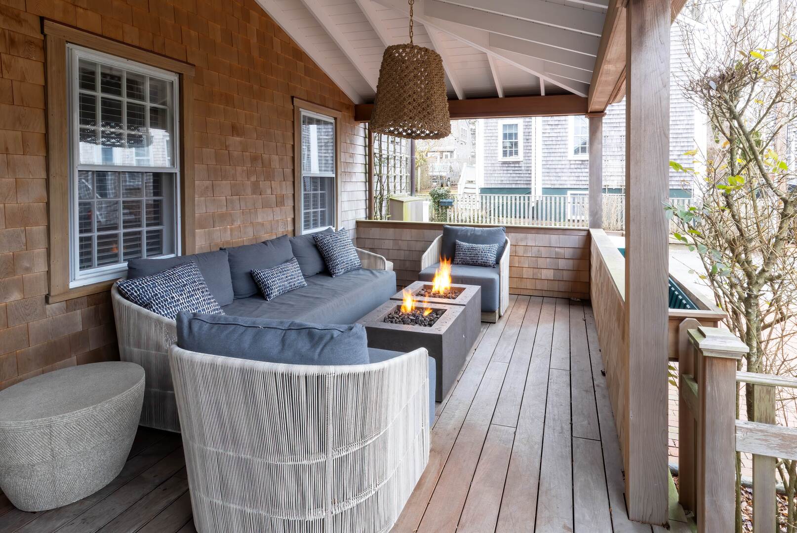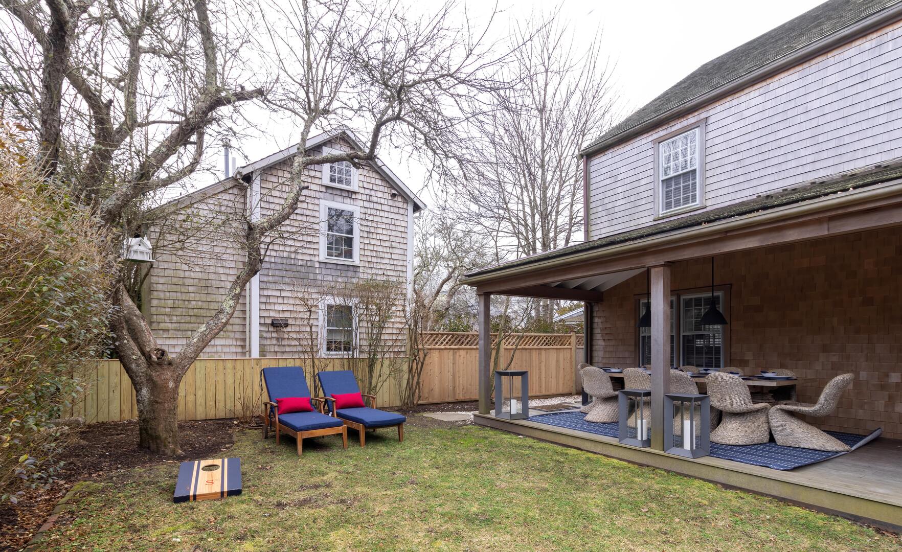 Embrace the charm of an idyllic Nantucket property just over one-half mile from the Nantucket Downtown Historic District, the Whaling Museum, restaurants, and shops. With access to a dedicated biking/walking trail even closer. The Miacomet Golf Course, Cisco Brewery, Bartlett Farms, and many beaches are all within a three-mile radius. Take a stroll on the cobblestone streets, relax at the beach, explore boutiques and galleries, or play a leisurely round on a scenic golf course just minutes away. A beautifully designed outdoor living space welcomes you with plush seating, porch swings and a tranquil yard surrounded by lush greenery. The spacious yard is set with corn hole, croquet set, and loungers for those lazy days to relax and renew. There is a BBQ, outside living area, and a 10-seat dining table for dining alfresco on warm summer evenings. Then gather around the fire pit for s’mores under the stars.