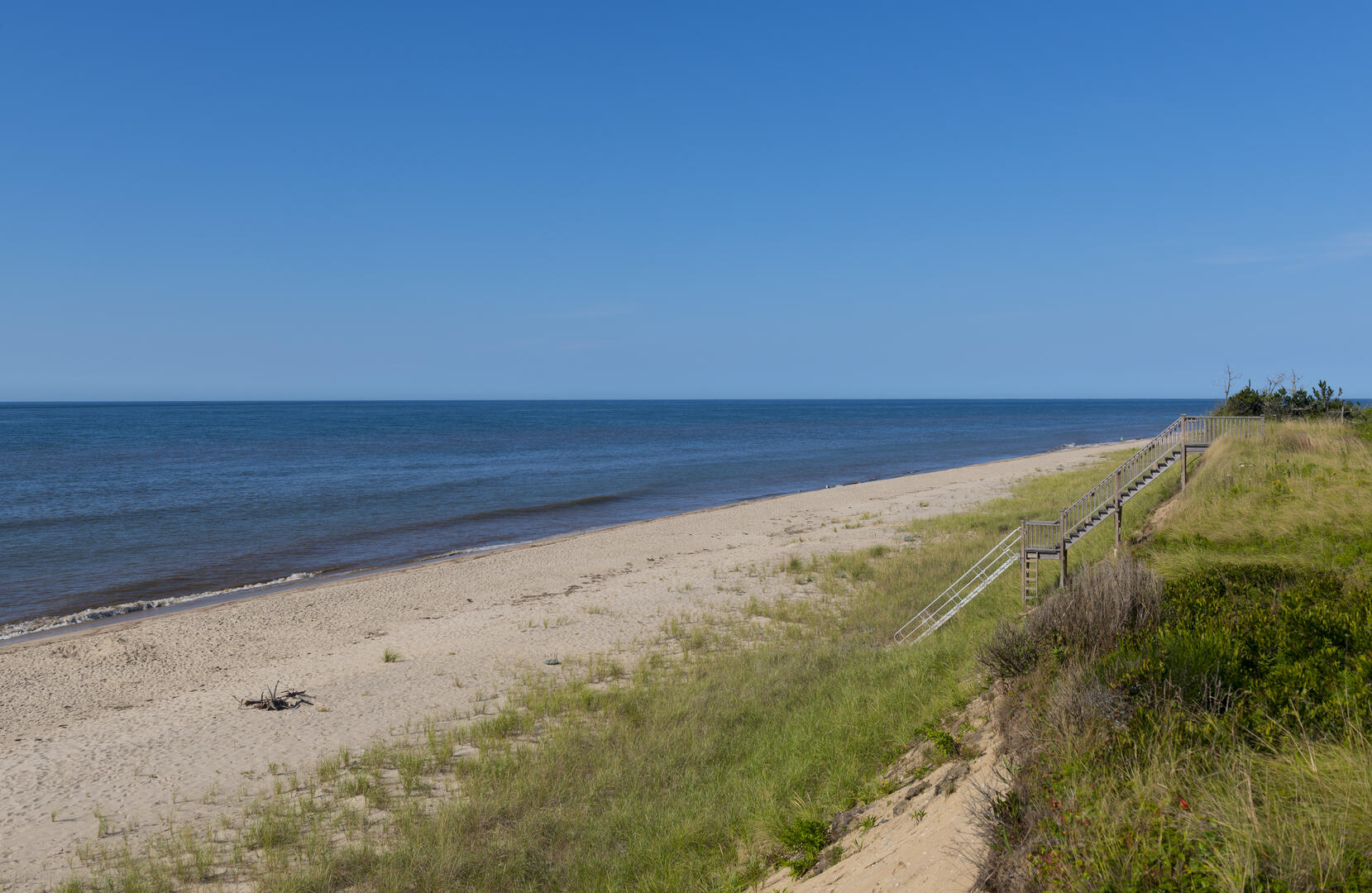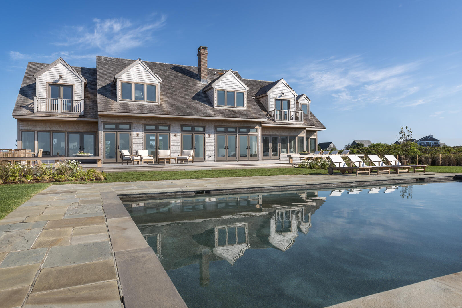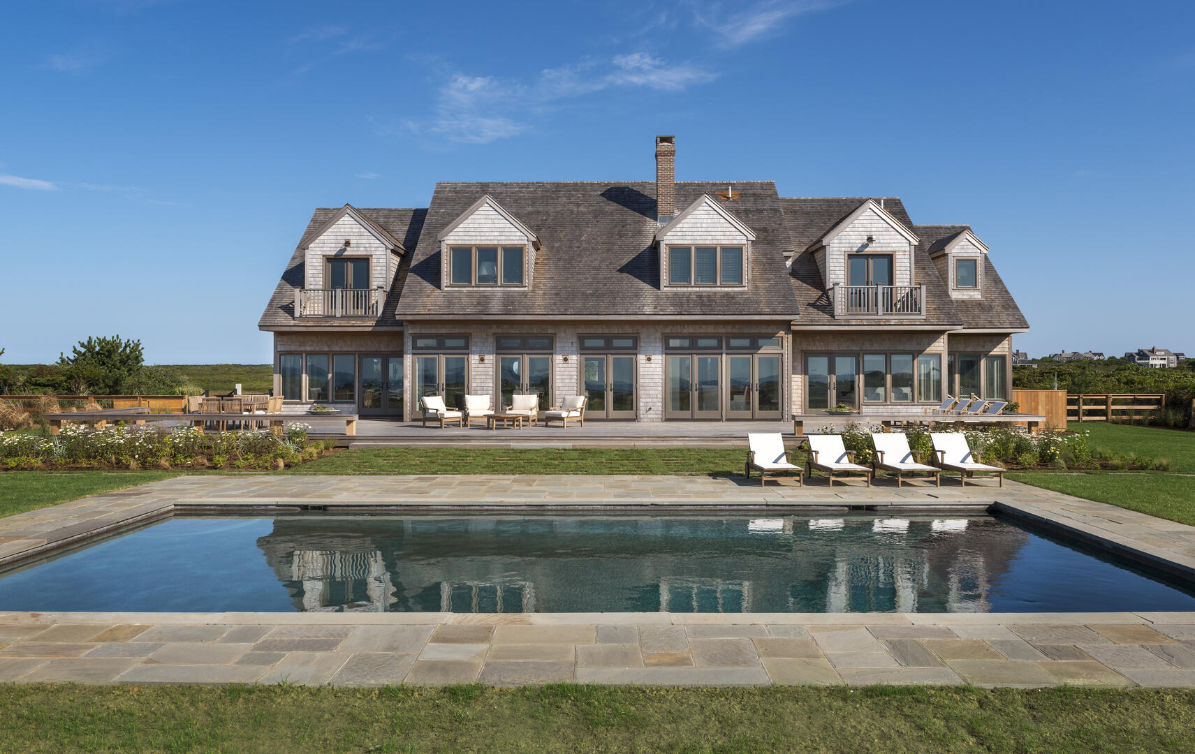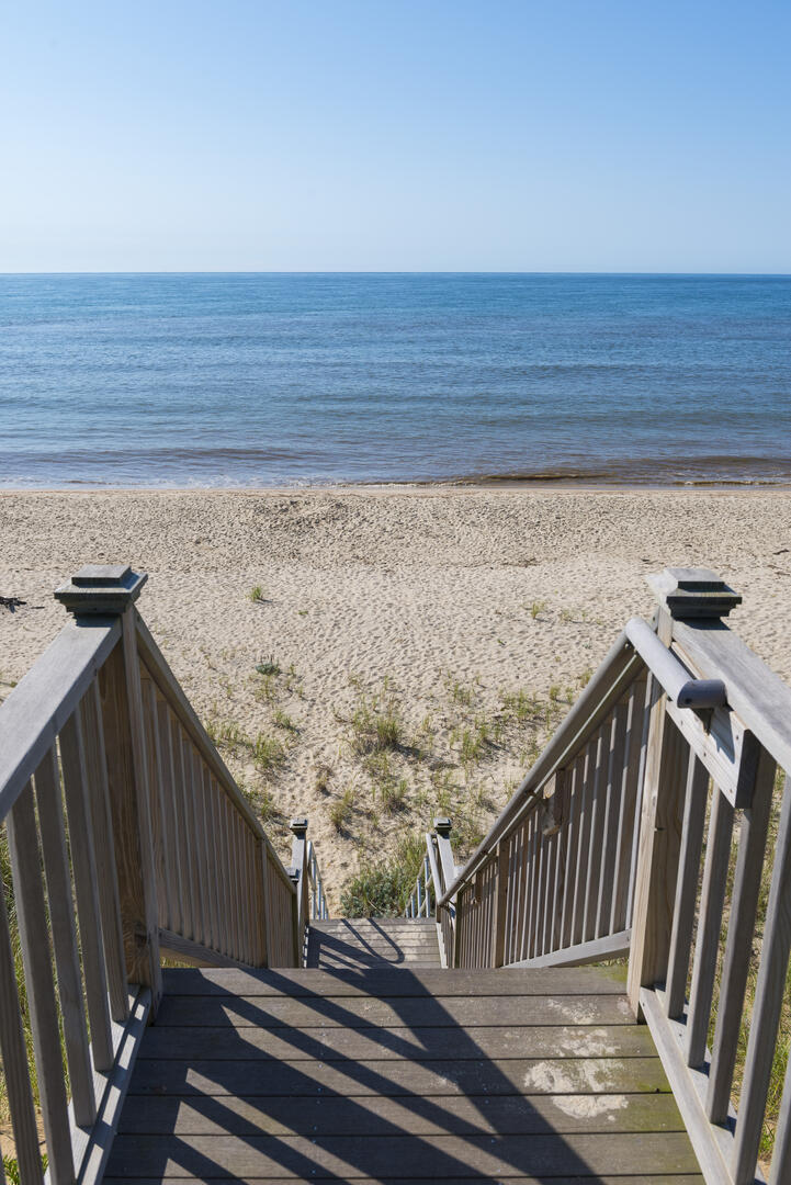 New construction built in 2014 on waterfront estate property. This 3 acre property has a new spectacular 7500 sq ft, 5 bedroom home, with ocean views from every room. Only 400 feet over a perfectly manicured lawn to the ocean and a private beach with 125+ feet of ocean frontage below a towering 50 foot high bluff. The gunite pool with blue stone patio, deck and yard have commanding 180 degree of the Atlantic Ocean and rear views of 300 acres of conservation land. The home is close to the Nantucket Hunting Association and Tom Nevers Field. This home has many amenities including en suite bedrooms, a chef’s kitchen outfitted with Viking appliances, central air conditioning, and more.