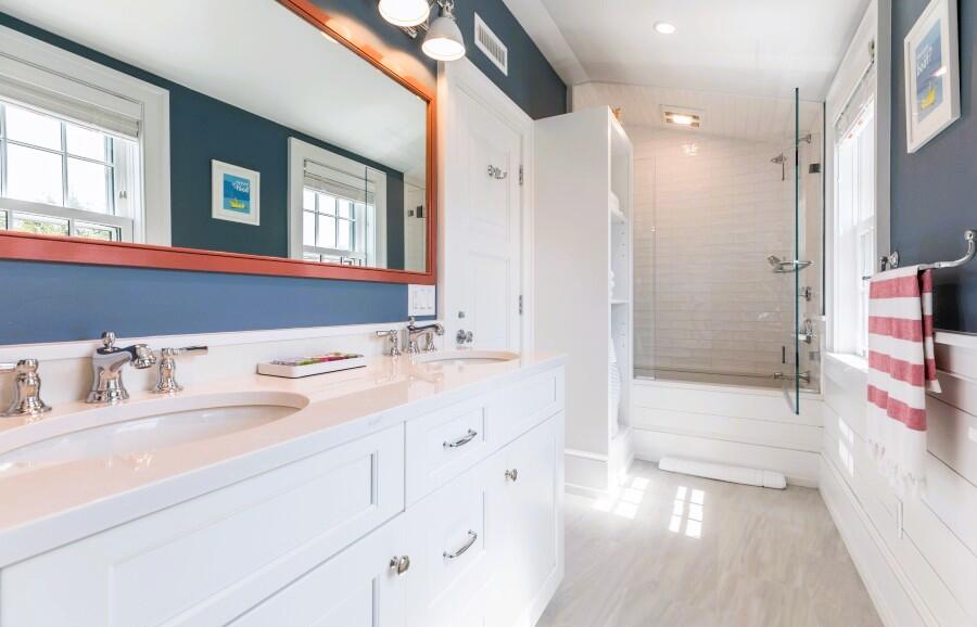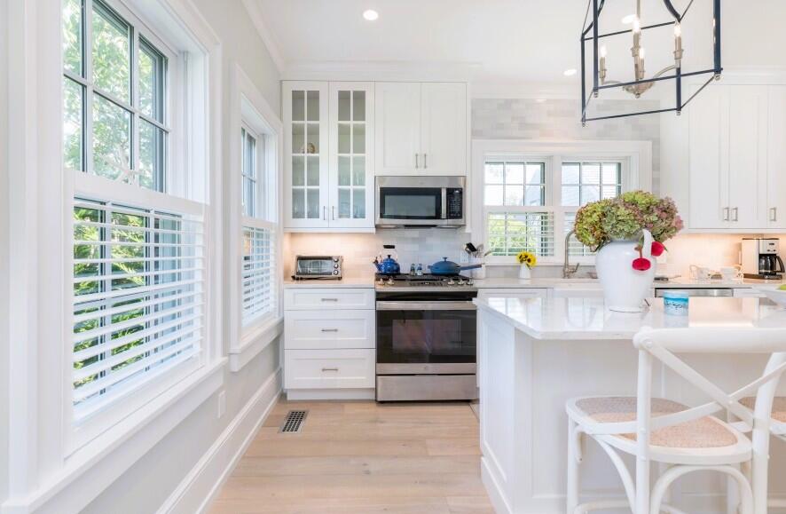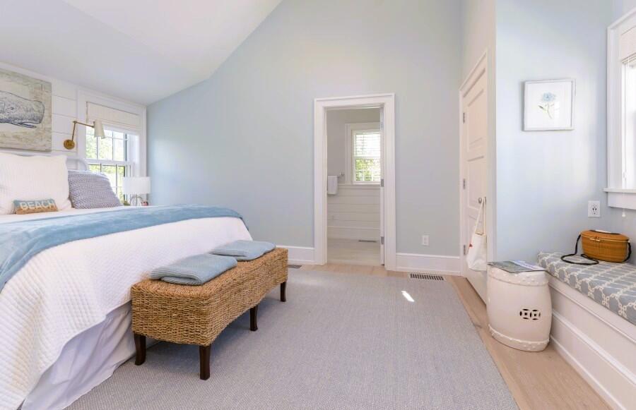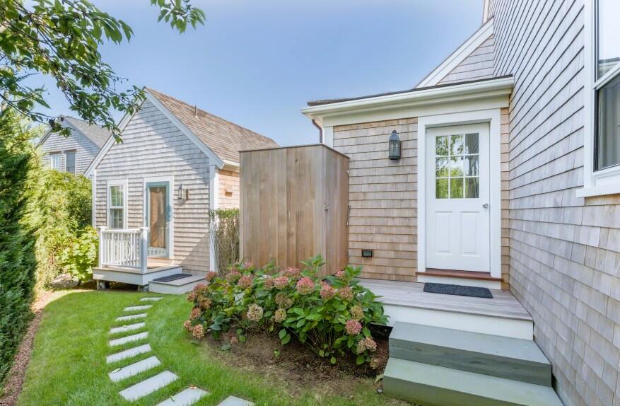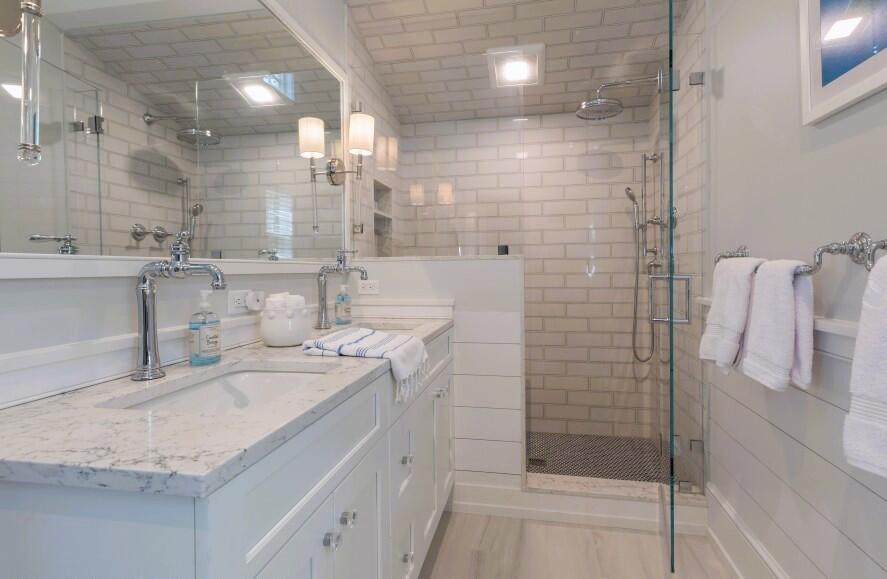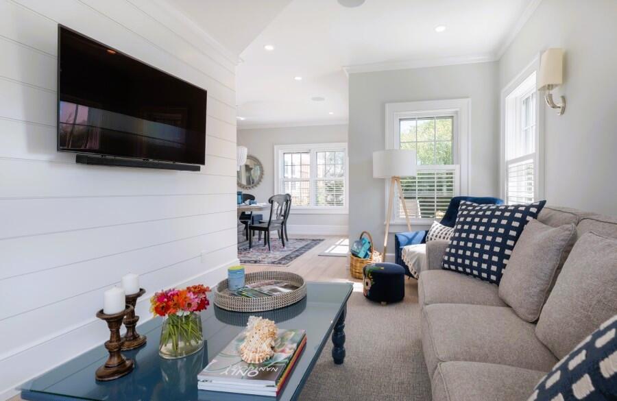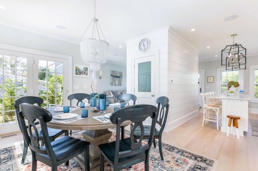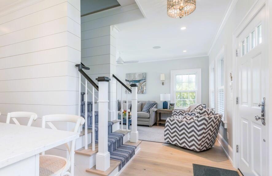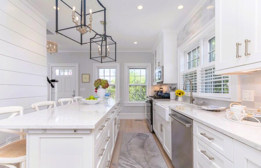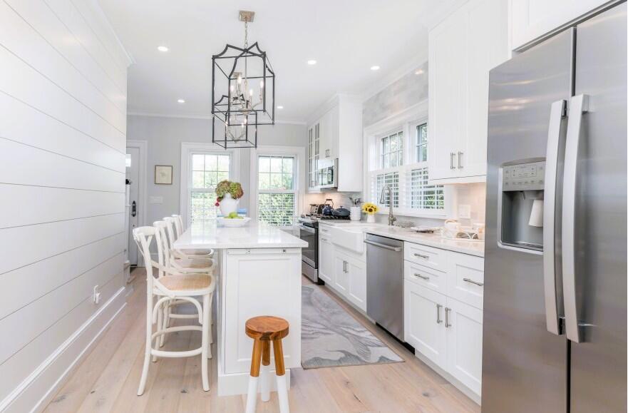 Located on a one-way street at the edge of town, this beautifully renovated and decorated home is close to shopping and dining in the downtown area. The first floor includes a living room with comfortable seating and large flat-screen television, a well-equipped kitchen with quartz countertops, stainless steel GE appliances, and island seating for four. Just beyond is the dining area with seating for six and French doors out to the back patio. Off of the kitchen is a mud/laundry room with a washer and dryer and a powder room. The master bedroom suite has a king bed, and a bathroom with double sinks and a glass-enclosed tiled shower. There are two guest bedrooms on the second floor, one with a queen bed and the other with twins. The bedrooms share a hall bathroom with double vanity and a glass-enclosed tiled tub/shower combo.