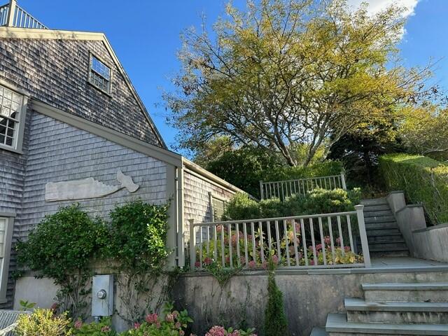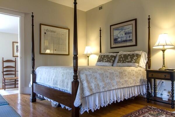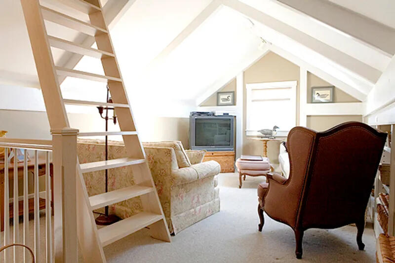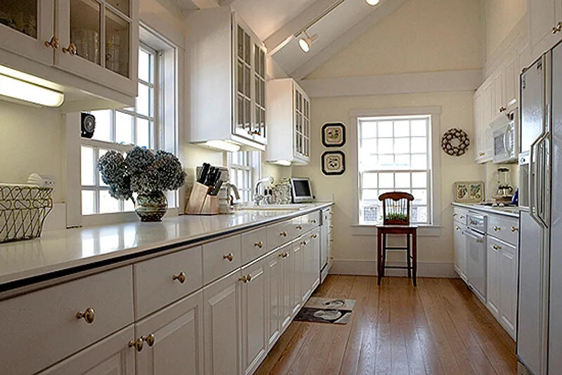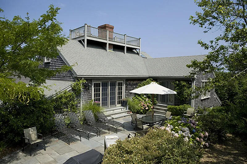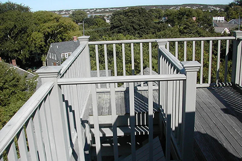 Spacious 5 bedroom home located on a quiet street in town. First floor: large foyer, queen bedroom that shares bathroom with twin daybed and pullout trundle bedroom, queen bedroom and bedroom with two doubles. Second floor: open floor plan with cathedral ceilings and French doors leading to terrace from both living room and dining area. King owner suite with full bath including jacuzzi tub and French doors to patio. Galley style kitchen opens to great room. Third level loft with full sleep sofa. Blue stone patio. Widow’s walk. No smoking. High Speed Wireless Internet Access.