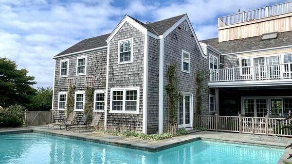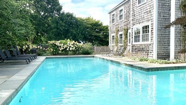 Large home in Brant Point with heated swimming pool. First floor: Large living room, sun room, wet bar, den with TV, balcony library above billiard room, office. Formal dining room, large open kitchen, dining area with fireplace. Laundry room, powder room, 2 car garage, patio with in-ground pool. Second floor: Sweeping staircase to landing with balcony overlooking heated pool. Primary bedroom with King Bed, dressing room, marble bath, jetted tub, and deck. Two additional king en suite bedrooms and two twin en suite bedrooms and a nursery. Apartment with open living room, dining area, kitchenette, twin bedroom, and bath has separate entrance and staircase but is attached to house. Third floor: Sleeping loft with two twins on the floor, steps to widows’ walk with fabulous water views of harbor, town, and cliff. Huge yard enclosed by private hedge.