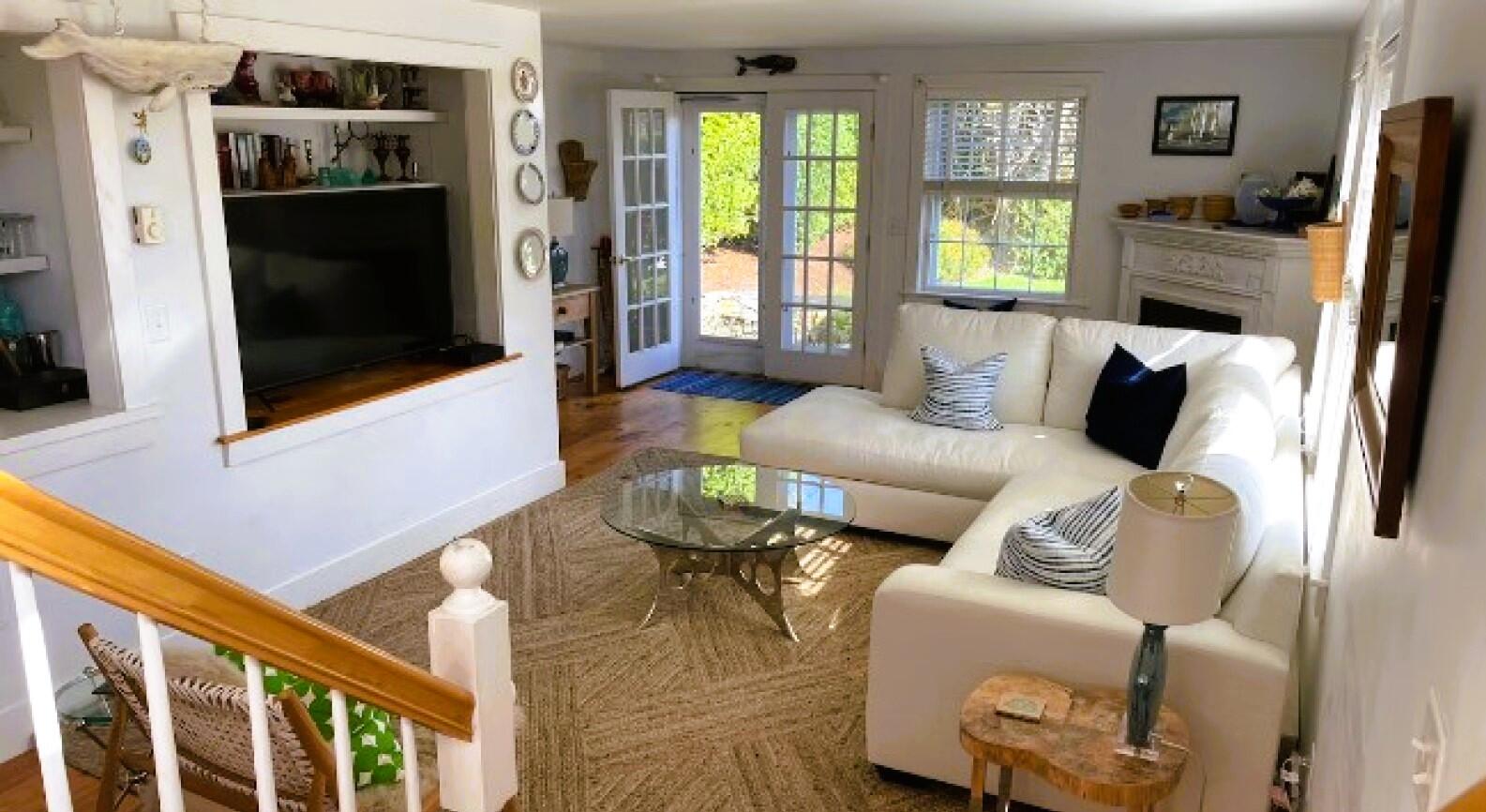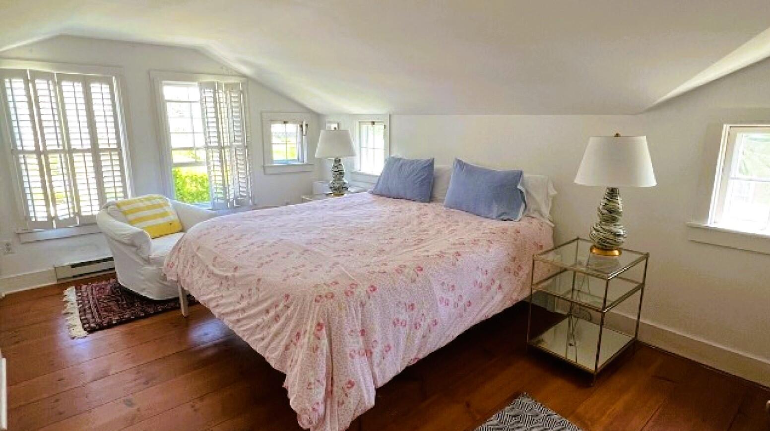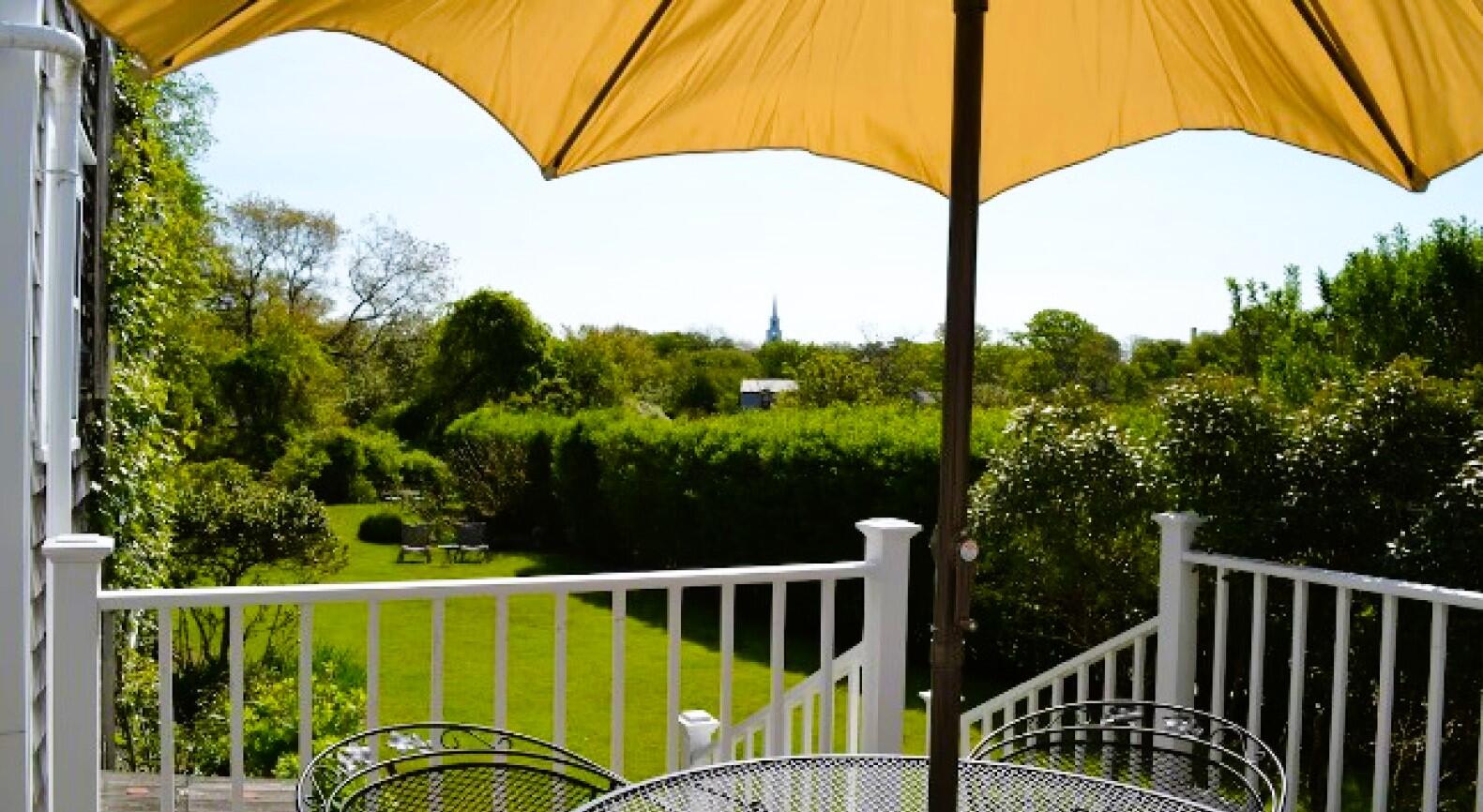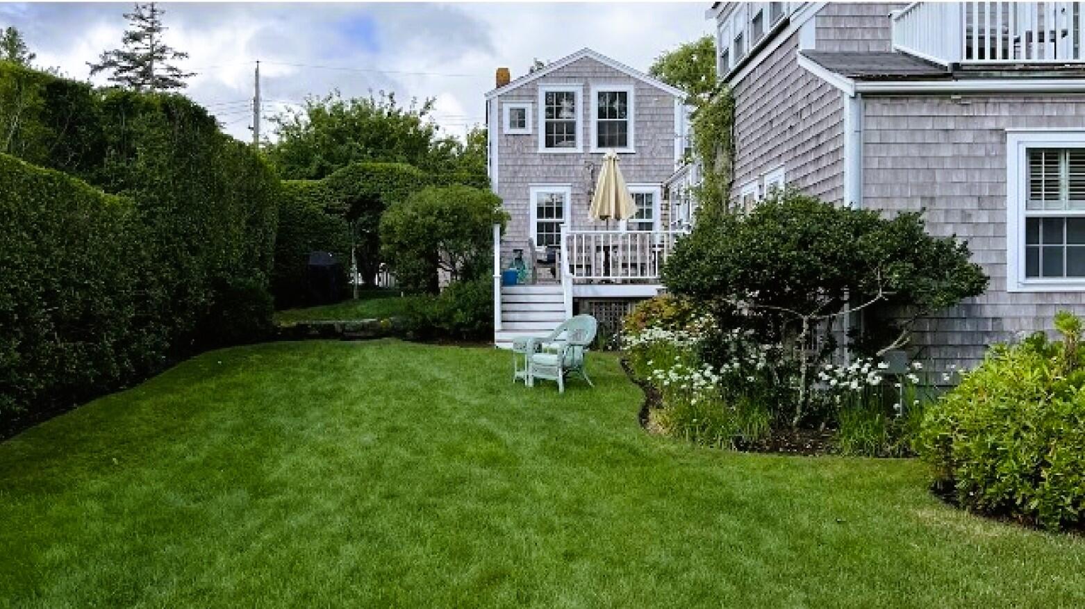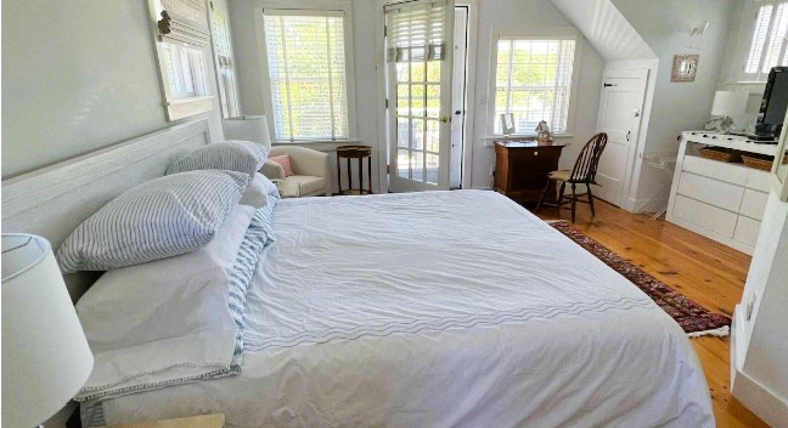 Charming in-town home with exceptionally large yard and beautiful gardens. First floor: Living room, dining room, kitchen, bedroom (double), bath (shower), laundry, new addition with TV room with wet bar, french doors to patio and gardens. Second floor: bedroom (twins) with private bath (tub with handheld shower), bedroom (trundle), Separate stairs to master bedroom suite with sitting area, private bath (shower) and private deck.