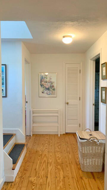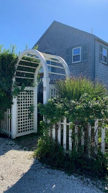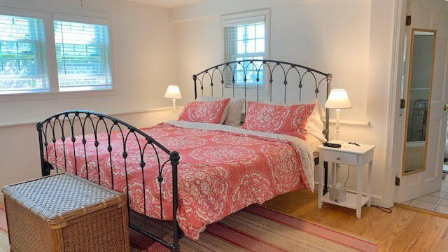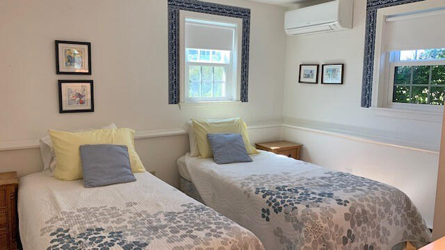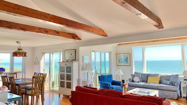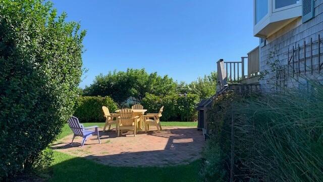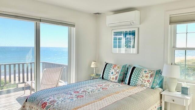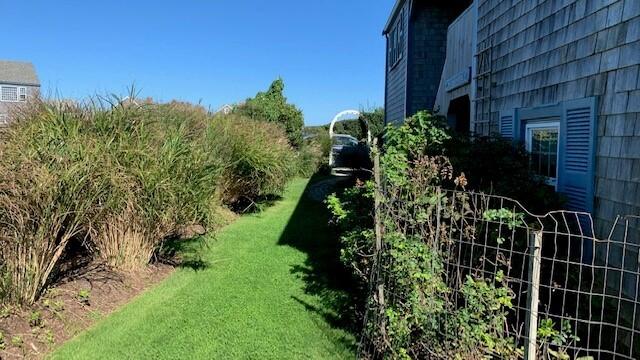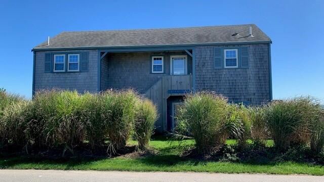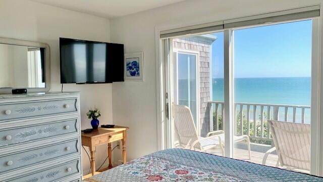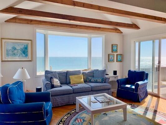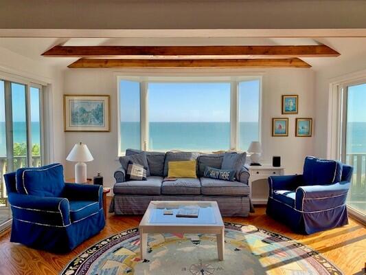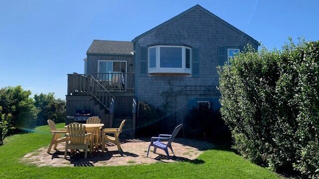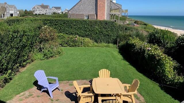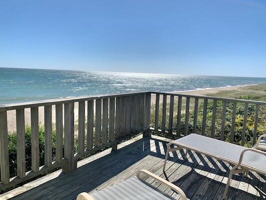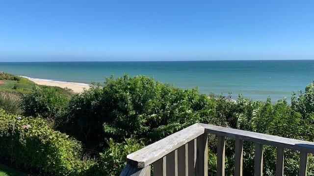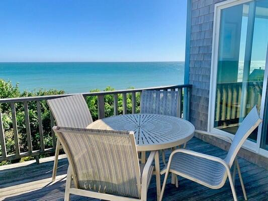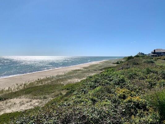 Contemporary beach house on the bluff in Tom Nevers. First floor: King master bedroom w/fireplace/ensuite; Twin bedroom, bedroom w/trundle, bath.. Second floor: Open kitchen/living/dining with deck access; queen bedroom with deck access, bath. Brick patio. 180 degree ocean views from second floor decks. Shared steps to the beach are 100 yards away..